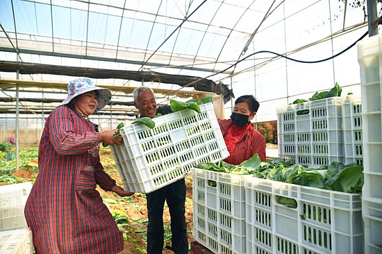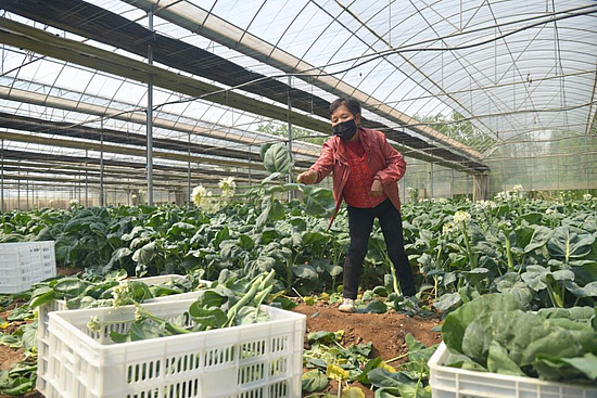 刘亚线娴熟地采收着芥蓝,不一会儿工夫,就装满了菜筐,和姐妹们抬着菜筐放到三轮车上后,又帮着三轮车师傅将装好的蔬菜转运到大棚外的货车上。刘亚线边走边擦着汗水,放好后,又回到大棚里继续采收蔬菜。