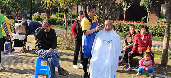 在趣味运动会进行的同时,在广场旁边我们的志愿者为已脱贫户和群众免费理发,不仅为他们解决了实际问题,更拉近了与群众的关系,收到了良好的效果。