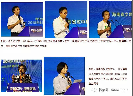 扶贫扶志故事汇环节由《中国扶贫》杂志社副社长兼执行总编文炜主持。扶贫一线的返乡创业者、湖北省英山县神峰山庄总经理闻彬军,海南省琼中县湾岭镇岭门村原驻村第一书记黄海军,海南省文昌市东郊镇椰林村脱贫户郑岗,海南股权交易中心、众筹海南扶贫项目负责人班淼琦,北外国语大学大一学生、国华纪念中学毕业生周靖纷纷讲述了扶贫扶志扶智的动人故事。