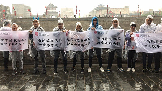 西咸新区近百名扶贫干部不畏风雨,如约而至,共同聚集在西安城墙安远门下,踏上了西安城墙13.7公里的征程。