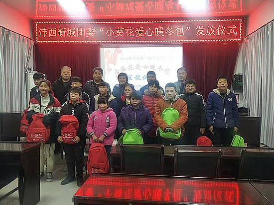 仪式上,新城团委及爱心企业一同将“暖冬包”发放到孩子们手中,并鼓励孩子们要克服困难,好好学习,强身健体,做一名德智体美劳全面发展的好少年。