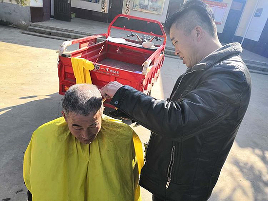 正在接受理发服务的贫困户高兴地说:“理发师上门给大家免费理发,让我们精神焕发,政府想得细致又周到,我们心里暖暖的。”