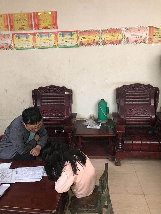 帮扶领导静心辅导学生的作业、用心解决作业中存在的难题,并与学生进行交流