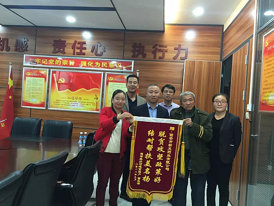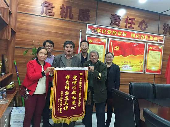 9月29日上午,贫困户曹长海为沣东新城建章路街道非公三联党支部西安市新龙药业有限公司送上了“党旗引领献爱心 帮贫解困显真情”和“脱贫攻坚政策好 结对帮扶善名扬”的锦旗,以此表达自己深深的感谢。