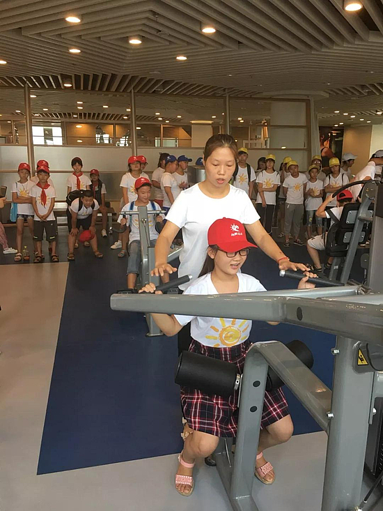 在工作人员的带领和讲解下,孩子们依次参观了游泳馆、羽毛球场、乒乓球场、篮球场、健身房等,在专业健身教练的指导和协助下,亲身体验了动感单车、健身车、划船机、椭圆机等健身器械。从小培养体育锻炼的兴趣和习惯,是孩子们成长为国家栋梁的基础。
