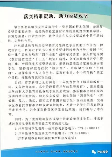学生资助是一项重要的保民生、暖民心工程,事关脱贫攻坚,事关社会公平。在习近平新时代中国特色社会主义思想指引下,坚持以人民为中心的发展思想,确保了“不让一个学生因家庭经济困难而失学”,落实教育部“进一步加强学生资助工作”要求,沣东新城教育局认真组织编撰了《沣东新城学生资助政策指南》,全面向学生、家长及各学校公布了2018年学生资助政策,欢迎广大家长、学生咨询、办理,沣东新城教育局将全力做好贫困学生的“店小二”,为贫困学生圆梦助航。