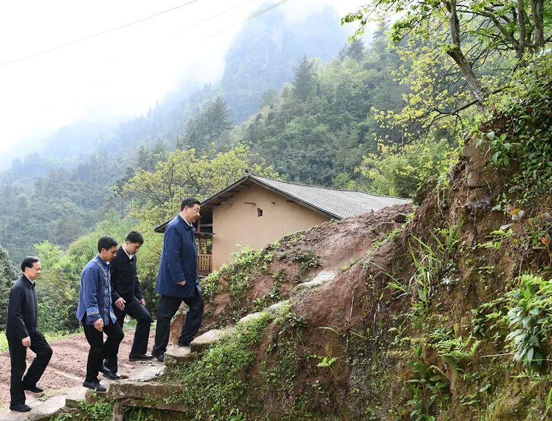 2019年4月15日,在重庆市石柱土家族自治县中益乡华溪村,习近平踏着湿滑的石阶登上陡坡,前往贫困户谭登周家看望。