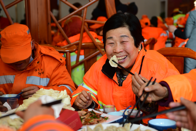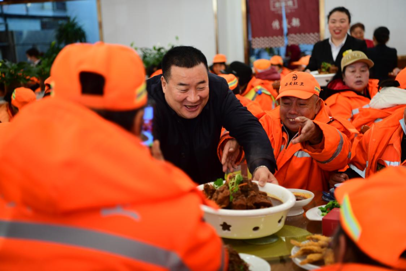 “一开始店面很小,就在店外支个棚子,夏天最热的时候给路过的工人,提供免费的绿豆汤,后来慢慢做大了就送一些藿香正气水等降温物资,冬天的时候,在小年夜邀请环卫工人来吃团圆饭,今年天气冷,我就想冬至先让大家来吃顿饺子暖和暖和”。