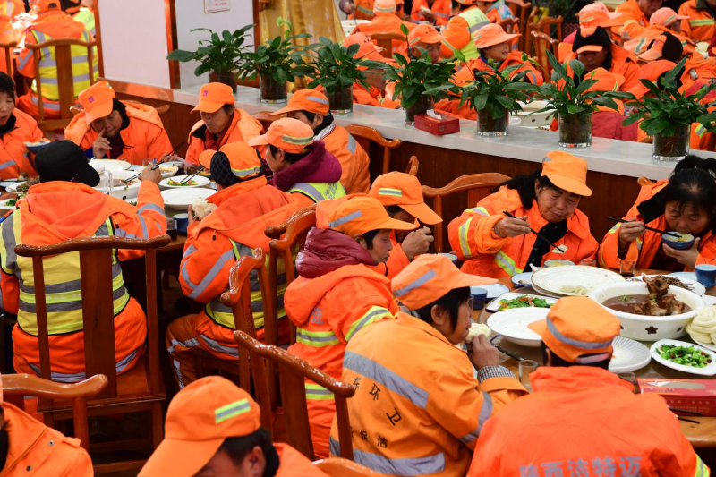 临近中午,刚刚完成清扫的环卫工们陆续来到湘味楼,大厅内升起热气腾腾的白烟,寒暄声、聊天声此起彼伏,王群淲一边笑着招呼环卫工们落座一边煮饺子上饺子上面汤。