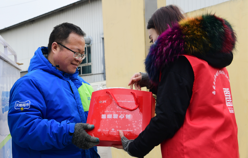 “哇,送给我的围巾居然是粉色的!”正准备出门送货的快递员曲乐打开“快递”后十分惊喜。她身边的同事林志鹏则直接拿出“快递”里的一顶帽子戴在头上:“早上出工没来得及准备帽子,还担心大冷天的要跑一整天,这个‘温暖包’真及时。”