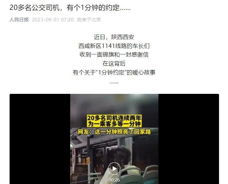 2023年8月,西咸新区官方微信发布《1分钟的约定》纪录西咸公交集团1141路末班车20位车长连续两年多等末班车乘客1分钟的故事,受到了媒体和网友的广泛关注和好评。