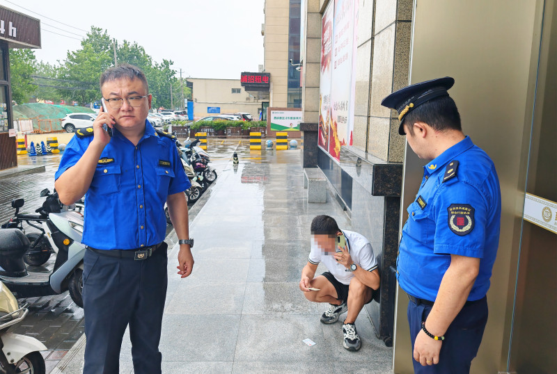 7月15日上午11:36,执法队员赵争举、杨剑巡逻返程至建章商业中心楼下时,看到道沿台阶上有人求助便上前查看,只见求助者脸色发白蹲在地上不能站立,身旁还立着一个拉杆箱。