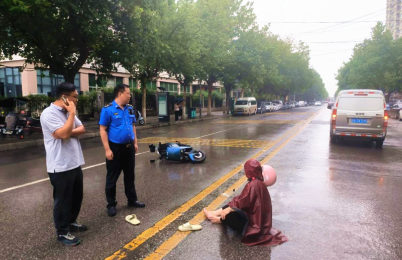 救助结束后,执法队员张智宏、周本全开车返回驻地,路上又遇见一位驾驶电动车的女士,因为雨天路滑、骑行视线受到影响连人带车摔倒在马路上,无法起身,两人迅速停车施救,马路上车来车往,担心女士二次受到伤害,张智宏、周本全一个拨打急救电话,一个疏导交通维护现场