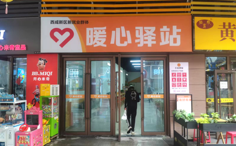 在沣东新城核心商圈吾悦广场,“暖心驿站”成为外卖快递员的“能量补给站”。驿站内,空调恒温休息区配备舒适座椅,免费热水供应点与阅读角形成温馨空间,成为骑手们候单间隙的“充电窗口”。