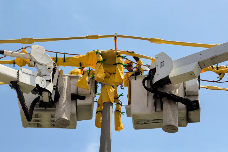 当日,户外环境温度已突破40℃。对于带电作业人员张阿龙和任晓峰而言,这只是“基础温度”。当他们按照规程,一层层穿上密不透风的绝缘服、戴上厚重的绝缘手套、套上全密封的绝缘靴后,整个人就如同处于一个“移动的蒸笼”中。