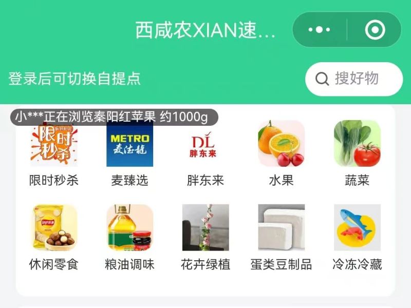 “西咸农XIAN”线上团购小程序:采用“基地直采+社区直供”模式,减少中间流通环节损耗,保障食材新鲜度。小程序现已上线蔬菜、水果、粮油等8大类共100余种精选单品,设置12个配送点,市民可线上下单,选择就近自提或社区直送服务。