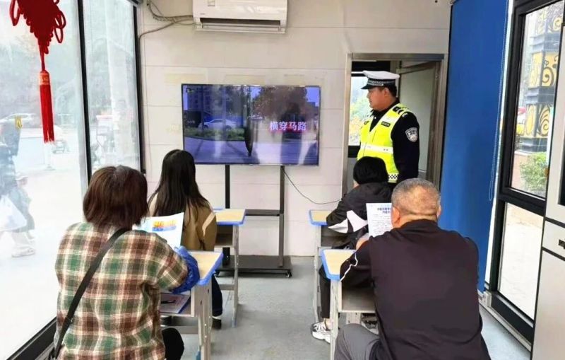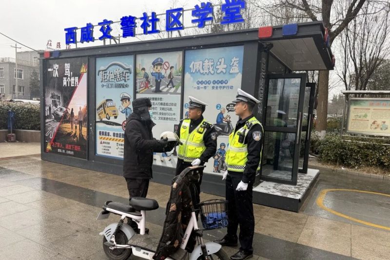 为破解这一治理难题,西咸交警执勤三中队从基础设施升级与创新服务两方面入手,精准施策。在社区执勤点,一间紧凑的警社共治“马路学堂”格外显眼:四张课桌整齐摆放,一台电视正循环播放着交通安全警示片。这里不仅是宣传教育的阵地,更是便民服务的窗口。针对居民忘戴头盔或因出行距离近、佩戴不舒服等原因不愿戴头盔的痛点,中队在社区学堂设立了共享头盔专柜,首批投放30个头盔供居民免费租借。