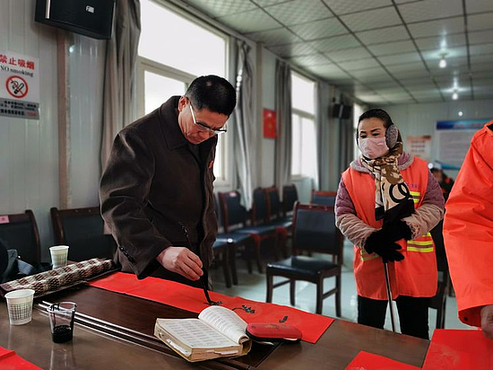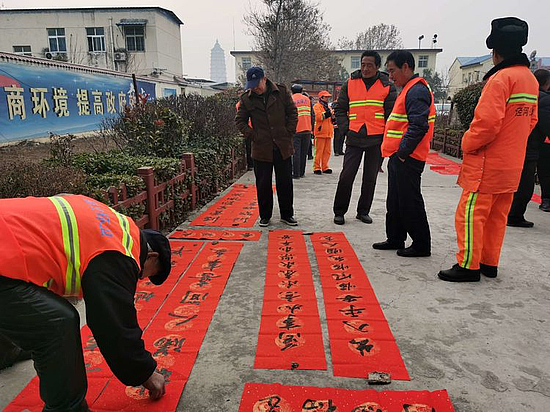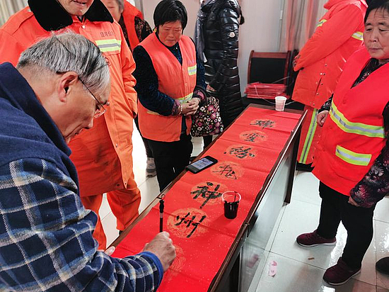 活动现场,崇文书院的各位老师挥毫泼墨,为群众写春联。惊叹声、赞美声从人们的口中流露,大家排着队一边欣赏一边等着领春联,飘着墨香的春联呈现在人们面前,群众接过后轻轻拿起,小心翼翼地拿到一旁晾干,一幅幅载满新春祝福的春联连同政府工作人员的真诚心意一起被送到居民的手中。环卫工人余大叔开心的拿着自己满意的对联说:“过年前得到这样礼物,让我既感受到了红红火火的年味,又收获了大家的关怀,这样的活动真实在,谢谢党和政府!”许多群众感觉儿时过大年写春联、贴春联的喜庆场面又回来了,他们认为手写春联是中华民族的传统,其中蕴含着深厚的文化内涵,词新字体也多变,回家贴在门边感觉更有年味儿!