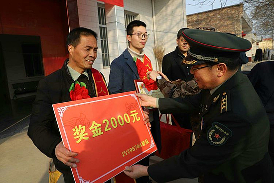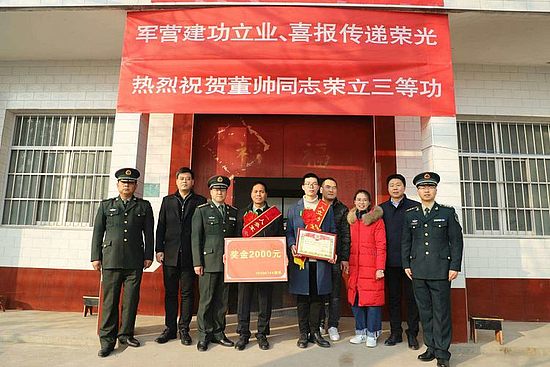 在阵阵喧天锣鼓声中,来访部队、区人武部等相关领导为董帅及其父母佩戴了大红花与绶带,颁发了喜报与2000元奖励金,并向他们表示衷心的祝贺。“孩子的荣誉就是我们整个家庭的骄傲,孩子能有今天的成绩,离不开党和国家的好政策,离不开地方政府的关怀,更离不开部队的精心培养。”接过儿子的喜报,董帅的父亲激动地说道。“董帅在部队立功受奖,喜报送到了家,为身边好男儿点赞!”村民们交口称赞道。