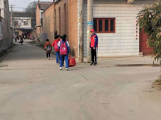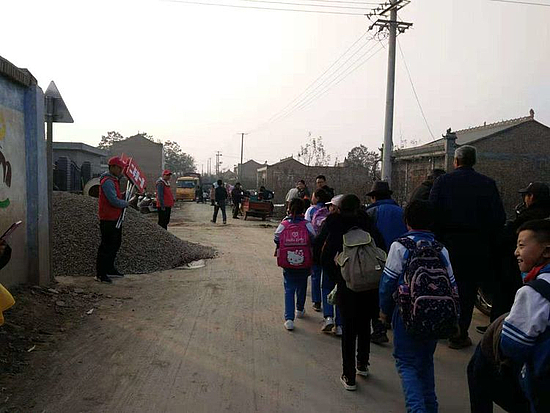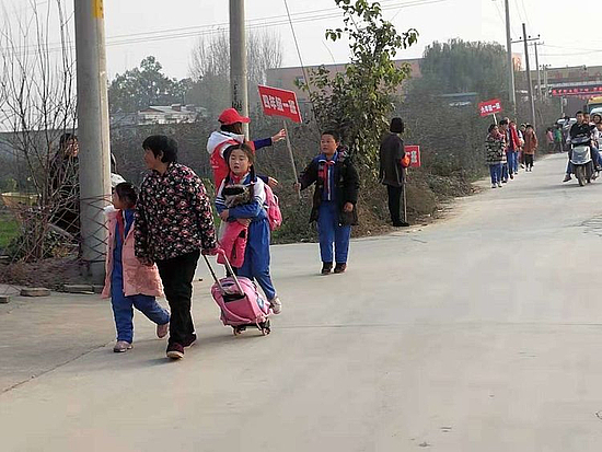 (志愿者老师护送路队到达各班的散队点)