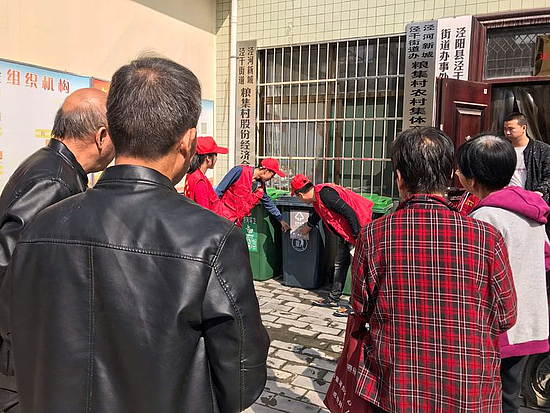 我村志愿者统一穿上志愿者马甲,手拿垃圾分类宣传单页,在村委会门口就四种颜色垃圾桶分别装什么垃圾进行讲解!