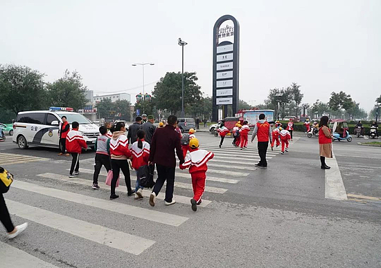 志愿者统一着红色志愿者服装,佩戴志愿者徽章,亮明志愿者身份,手持引导牌,在陵召十字开展“车让人,人守规”文明交通劝导工作。