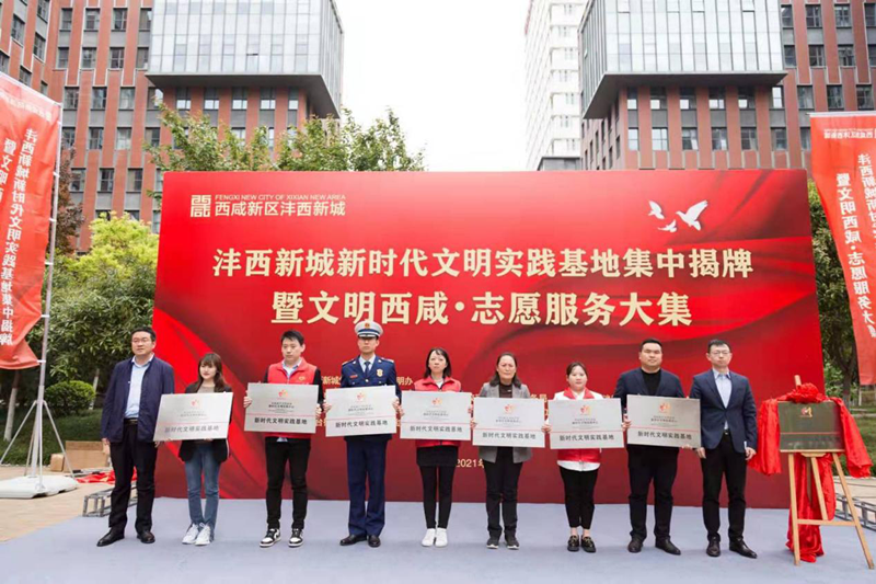 4月13日上午,西咸新区沣西新城举办新时代文明实践基地集中揭牌暨文明西咸·志愿服务大集,来自辖区各志愿服务队约100余人参加活动。