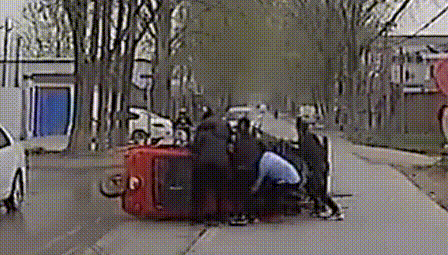 数名路人瞬间集结救人西咸公交1065路车长王磊,也刚好从此地经过,迅速将车辆安全停靠,向车上乘客简单解释后,冲下去与众人合力抬起三轮车。将老人救出。