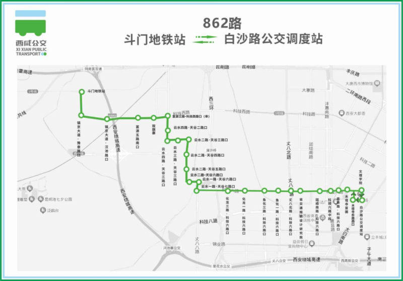 调整后停靠站点:斗门地铁站→镐京大道·豫章路口→镐京大道·汉池路口→富源五路南口→双旗寨→富源三路·科技西路口(单上行)→云水四路·天谷二路口→云水四路·天谷三路口→云水三路·天谷三路口→云水二路·天谷三路口→云水二路·天谷四路口→云水二路·天谷五路口→云水二路·天谷六路口→云水一路·天谷六路口→云水一路·天谷七路口→化龙三路·科技六路口→化龙一路·科技六路口→鱼化三路·科技六路口→鱼化一路·科技六路口→丈八北路·科技六路口→省交通规划设计研究院→科技六路·团结南路口→科技六路中段→高新路·科技六路口→木塔寺苗圃→文理学院(单上行)→木塔寺东路西口(单下行)→白沙路公交调度站