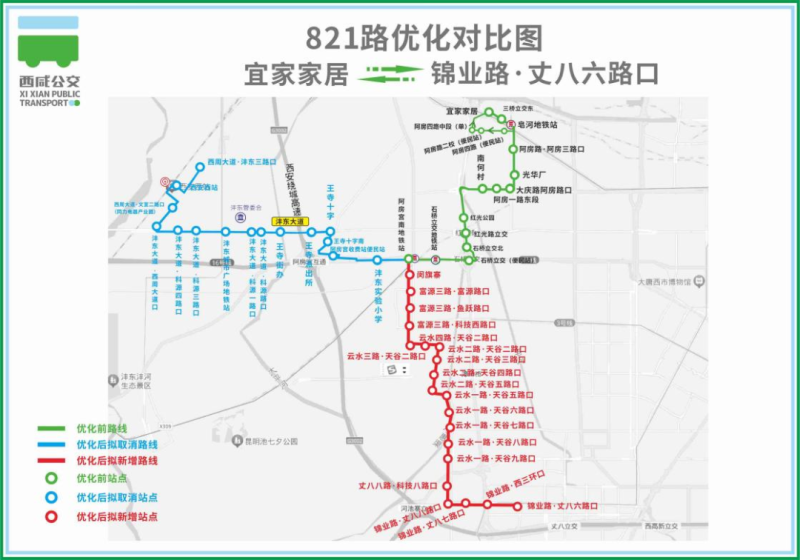 调整后:上行方向由“宜家家居”始发,经阿房四路、阿房路、阿房一路、西三环辅路、昆明路、富源三路、天谷二路、云水二路、天谷五路、云水一路、锦业路至“丈八六路地铁站”。