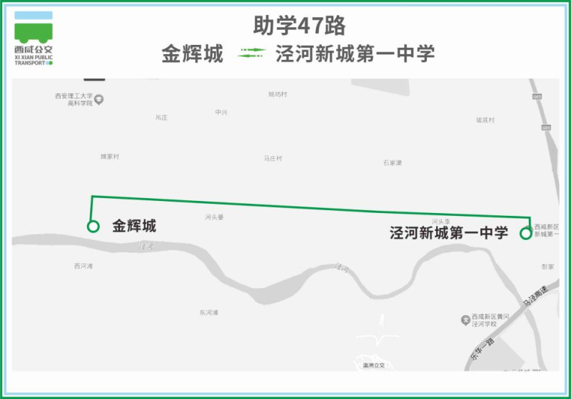 由“金辉城”始发,途经泾河大道至“泾河新城第一中学”,线路全长8公里。