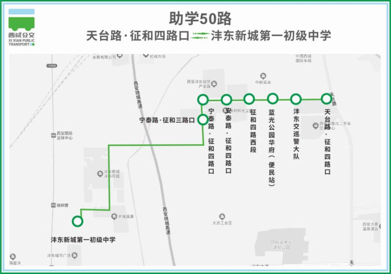 天台路·征和四路口、沣东交巡警大队、蓝光公园华府(便民站)、征和四路西段、安泰路·征和四路口、宁泰路·征和四路口、宁泰路·征和三路口、沣东新城第一初级中学