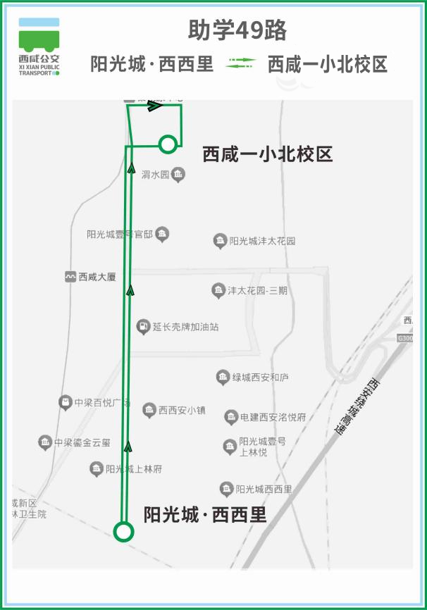 由“阳光城·西西里”始发,途径科贸一路、丰裕路,至“西咸一小北校区”,线路全长2.6公里。