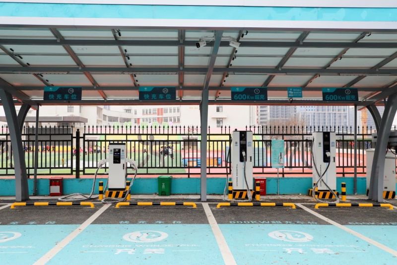 此次试运营的超级充电站位于能源金融贸易区阳光城小学东侧辅道。由定制光伏车棚、储能电池系统、充电站、电池在线检测系统、智慧能源管理云平台等组成。共配置22个充电车位,拥有2台720kW超充主机,配备2台600kW液冷超充、10台250kW双枪终端,并且预留了2台V2G双向充放电桩位置,最快可实现充电5分钟续航300公里。