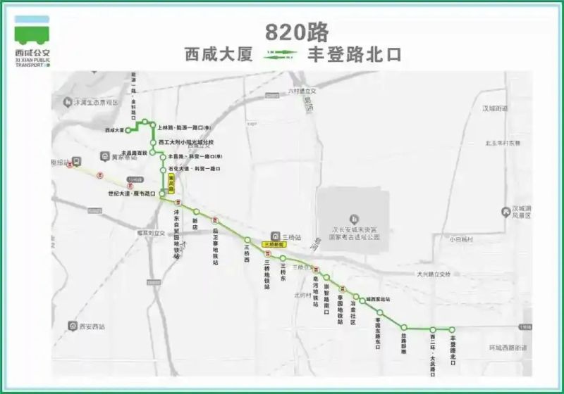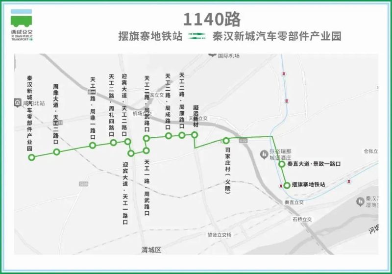 停靠站点:秦汉新城汽车零部件产业园、周鼎大道·天工二路口、天工二路·周鼎一路口、天工二路·周礼四路口、迎宾大道·天工二路口、迎宾大道·天工一路口、天工一路·周武路口、天工二路·周武路口、天工二路·周成路口、天工二路·周成路口、凝远新材、司家庄村(义陵)、秦直大道·景致一路口、摆旗寨地铁站