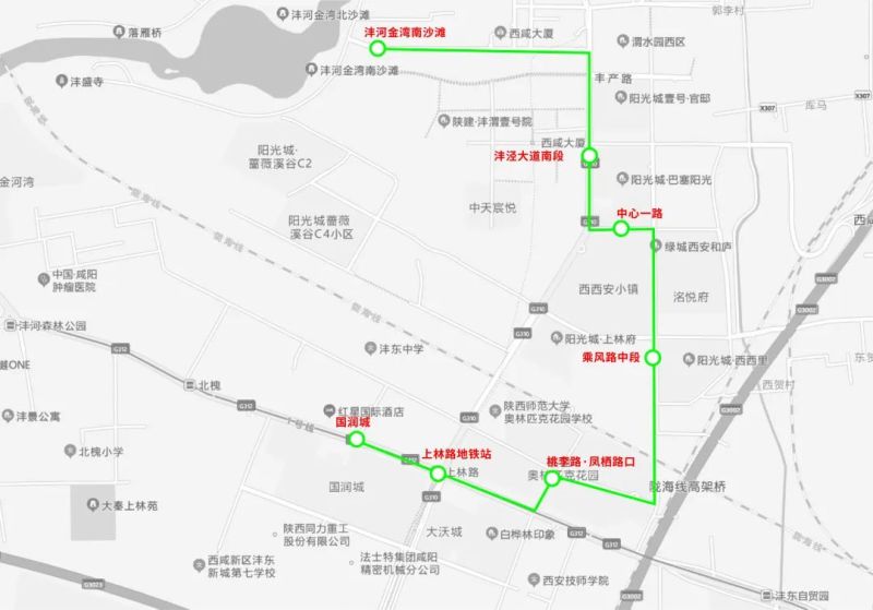 线路走向:由国润城始发,途径世纪大道、桃李路、凤栖路、乘风路、中心一路、上林路、沣新路至沣河金湾南沙滩。站点设置(7个):国润城→上林路地铁站→凤栖路·桃李路口→乘风路中段→中心一路→沣泾大道中段→沣河金湾南沙滩。