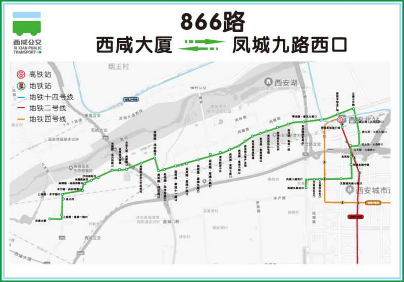 866路运营线路,该线路由西咸大厦出发,途径上林路、丰宁路、尚航四路、尚稷路、鸿志路、尚苑路、秦汉大道、建元路、元鼎路、凤城北路、凤城十路、朱宏路至凤城九路西口线路全长24公里,沿线设置停靠站点43个。运营时间:6:30-20:00。