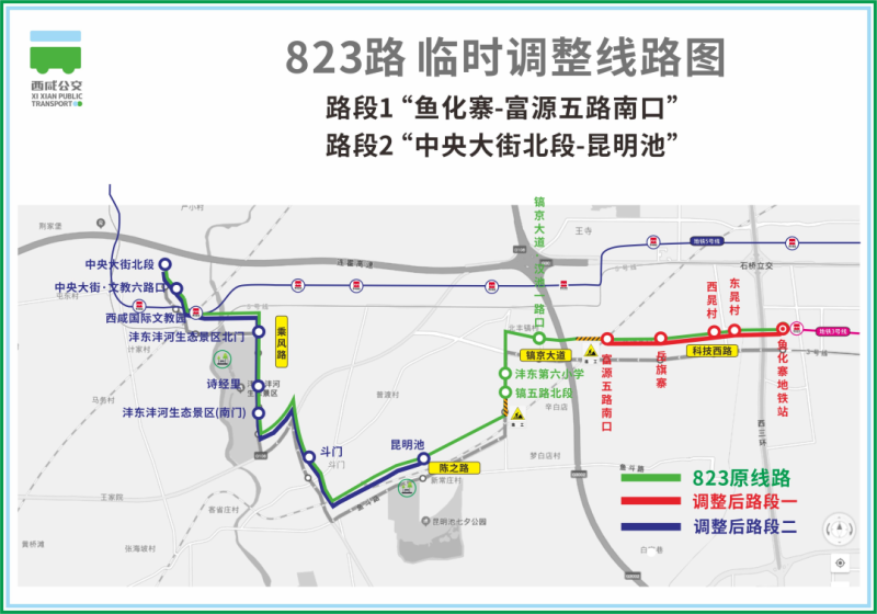 823路原线路临时采取分段方式运营:路段1为“鱼化寨-富源五路南口”;路段2为“中央大街北段-昆明池”。