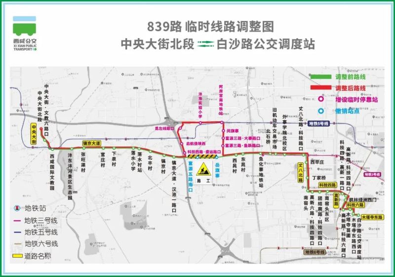 839路原线路部分路段绕行,由“科技西路-镐京大道”变更为“科技西路-富源三路-昆明路-盛运路-镐京大道”。