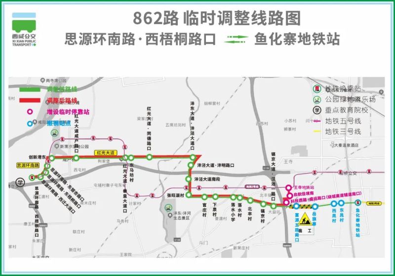 原由“思源环南路·西梧桐路口”前往“鱼化寨地铁站”的乘客,可乘坐862路在“科技西路·盛运路口、镐京大道·汉池一路口”下车后,同站换乘833路、837路、839路到达目的地。