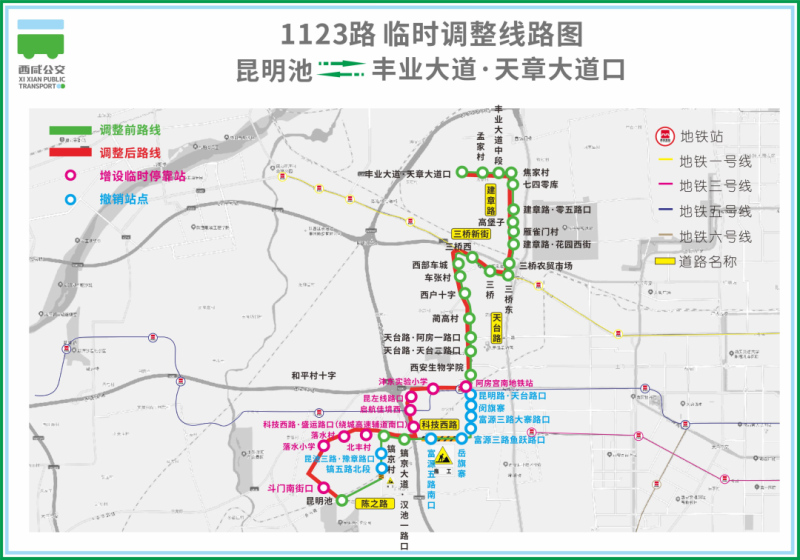 临时撤销站点:昆明池景区、昆明池东、豫章路南段(原镐五路北段)、豫章路·昆池三路口(原沣东第六小学西)。