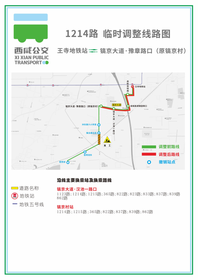由“昆明池-王寺地铁站”调整为“镐京大道·豫章路口(原镐京村)-王寺地铁站”。