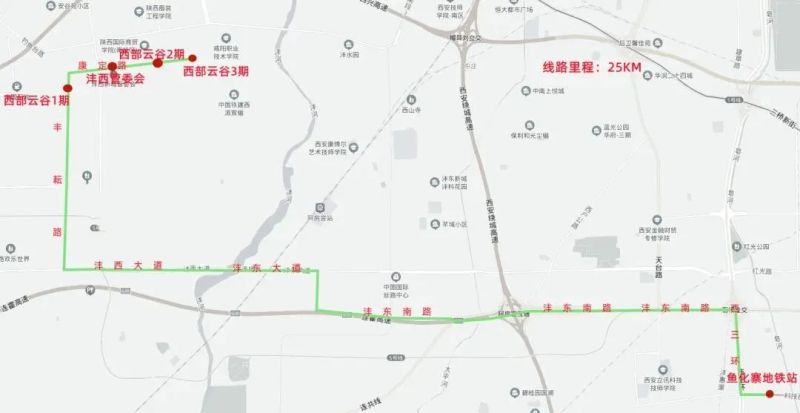 由鱼化寨地铁站始发,途经西部云谷1期、沣西新城管委会、西部云谷2期、西部云谷3期。