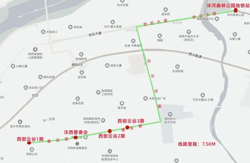 由沣河森林公园地铁站始发,途经西部云谷3期、西部云谷2期、沣西新城管委会、西部云谷1期。