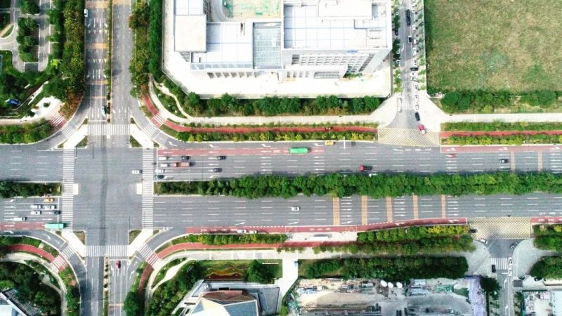 丰邑大道最大的特点就是“会喝水”。该条道路两侧路牙开口设置了截污模块拦污,在机非分隔带内布置有下沉式绿地、传输型草沟、生态滞留草沟、雨水花园等低影响设施,以雨水溢流井代替传统的雨水篦子,同时将人行道改造为透水砖铺装,在红线外绿地内设置生态草沟、调节塘等设施,如遇降水,雨水可快速流入绿地花园中,并用储存的雨水持续为植物补充水分。