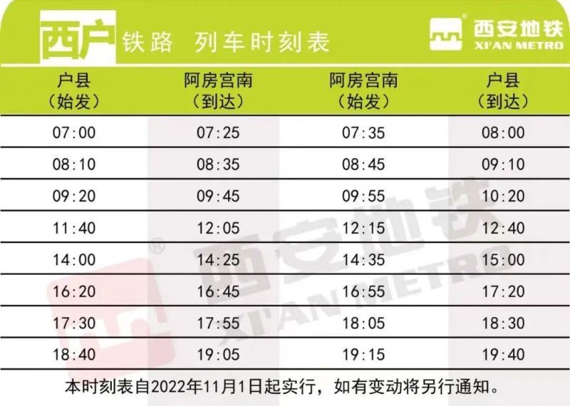 提升改造后的西户铁路成为全省首条市域(郊)铁路改造示范项目,沿途共设5站,分别为户县站、五竹站、马王站、昆明池站、阿房宫南站,开通初期投用阿房宫南站和户县站。阿房宫南站紧邻地铁5号线,821路、824路、826路、831路、838路、861路、1123路公交车均经过这里,新区的市民乘客如果要去鄠邑,转乘非常方便。