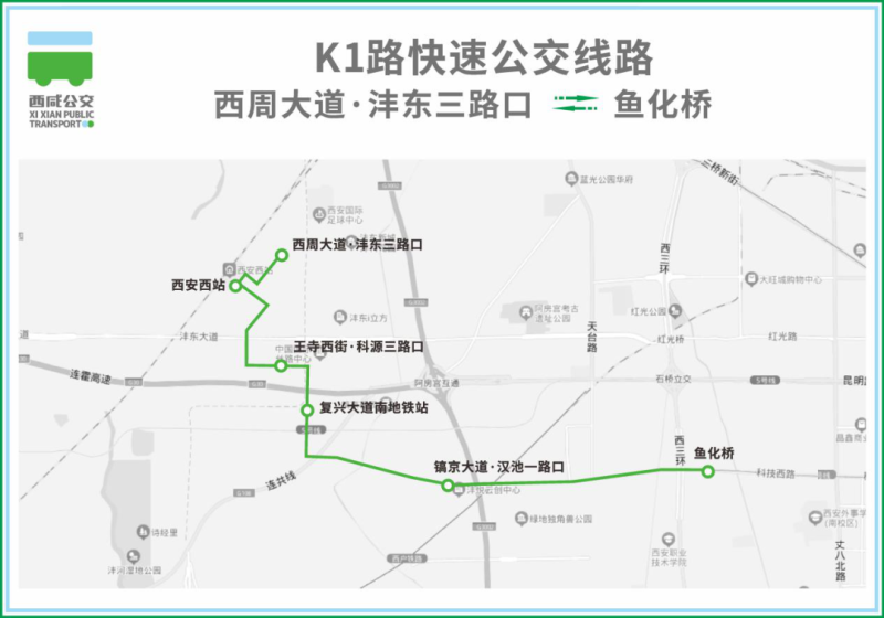 线路设置停靠站点6个,西周大道·沣东三路口、西安西站、王寺西街·科源三路口、复兴大道南地铁站、镐京大道·汉池一路口、鱼化桥,试运营期限为3月21日至5月21日,试运营结束后,将综合评估客流情况,研判线路持续运营的可行性进行优化调整。