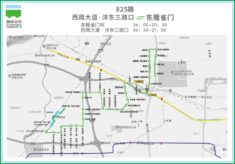 优化内容:线路由“阿房宫高铁站”沿西周大道延伸至“西周大道·沣东三路口”,剩余原线路走向不变。