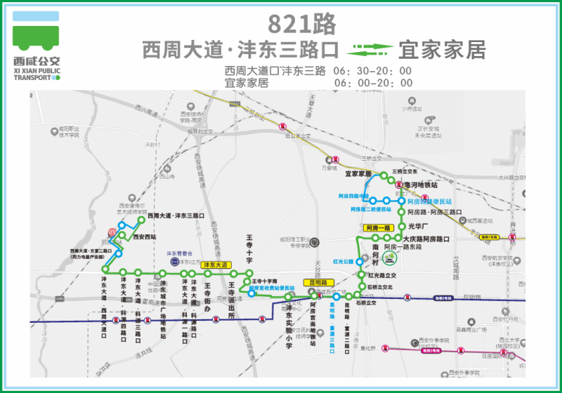 为缩短市民等车时间,821路现实行招呼站模式,从沣东城市广场地铁站开始至西安西站实行招呼站,上车请您招手,下车请提前按铃。此外,西咸公交同步开通821路区间,运营方向为宜家家居至沣东大道·科源一路口,提高市民出行效率,满足市民出行需求。