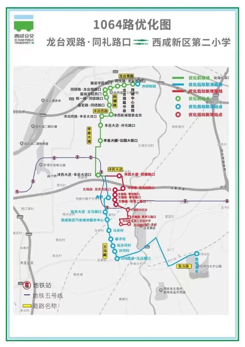 新增站点:文教园地铁站【5】、高桥地铁站【5】、镐京大道·王马路口、西咸新区汽车维修服务中心、马务村、寨子村、北沙河村、沙河村、108国道·王马路口、铁路桥村